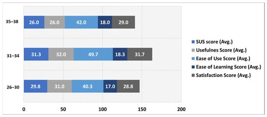 Figure 11 depicts the distribution of participants feedback for all the five aspects usability based on age group attribute. The age group 31–34 has the highest average scores for all the five aspects followed by the 26–30 and 35–38 age-groups, respectively. In the age group 31–34, the highest average score of the participants is for the ease of use aspect (49.7 out of 55) followed by usefulness (32 out of 40), satisfaction (31.7 out of 35), SUS score (31.3 out of 50), and ease of learning (18.3 out of 20) aspects. The age-group 26–30, which contains 60% of the participants, also has the highest average score for the ease of use aspect.