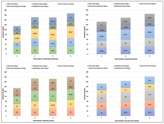 Finally, in the Appendix B, Figure A1, Figure A2, Figure A3, Figure A4, Figure A5 and Figure A6 show the individual responses of the participants for each of the questions listed for the SUS and USE questionnaire along with the participants’ rating for each of the tasks performed with ChatGPT for formal English language learning.