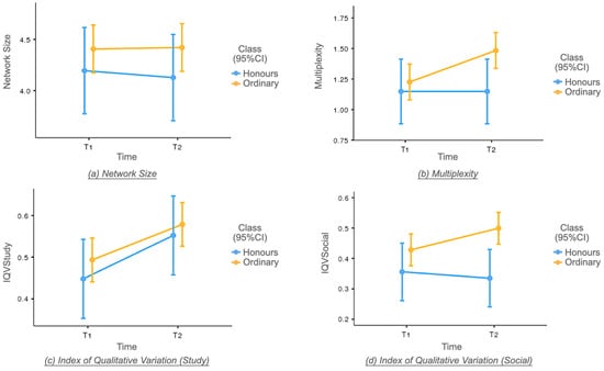 In addition, the non-honours students had a statistically significant but trivially small increase in multiplexity values in Semester 2 (F(1, 286) = 8.73, p < 0.05, |d| = 0.20), reflecting somewhat greater tie strengths (Mesch & Talmud, 2006 []). This suggests that the non-honours group had more friends who shared social and study experiences. Additionally, the non-honours group had slightly more social relationship variations in Semester 2 (social IQV F(1, 286) = 4.66, p < 0.05, |d| = 0.15). This finding underscores the increasing diversity of their social connections during their first year, suggesting a broader range of interactions and engagement.