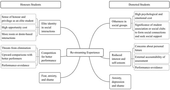 Thematic analysis identified three main themes for demoted students (i.e., otherness in social groups, reduced interest and self-esteem, and negative emotions of anxiety, depression, and shame) and three main themes for honours students (i.e., elite identity in social interactions, competition for better performance, and negative emotions of anxiety, fear, and shame). Below are exemplary quotations of students who reacted to their assessment and re-streaming experiences for each of the three themes. Figure 2 shows sub-themes nested within key themes for each group. Path lines show node associations within each group. The bracketed nodes are subthemes related to the superordinate node.