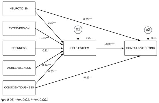 Beyond the documented impact of the personality variables in general and, specifically of the Big Five (BF) personality traits, on CB, one of the most important gaps in contemporary research is the identification of the mediating variables. The exhaustive review of empirical studies conducted in the field of CB shows that only materialism [38,46], hedonistic shopping experiences [23] and negative perfectionism [22] channel the influence of the BF on this behavioral problem. Another variable that, from the adjoining fields of CB, has recently attracted the interest of researchers with regard to its potential mediating role has been self-esteem. Indeed, it has been found that this variable channels the influence of the BF on smartphone addiction [47] and Internet addiction [48]. In the field of CB, however, no study has been conducted that looks into the role of self-esteem in the BF personality traits–CB link. And it is this very circumstance that has prompted this study, the purpose of which is to put forward a model of causal influences in which the BF personality traits are the exogenous variables, self-esteem is the mediating variable and CB is the endogenous variable.