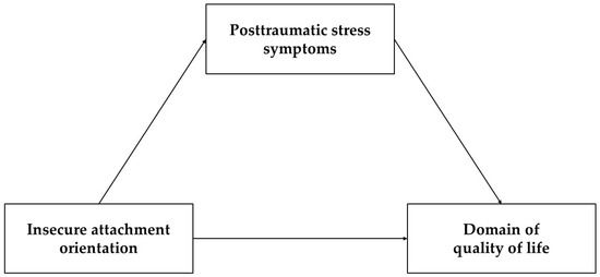 - Attachment anxiety and avoidance are indirectly associated with various domains of quality of life, including physical health, psychological status, social relationships, and environment, through the mediating effects of PTSSs (the hypothesized model is displayed in Figure 1).