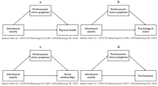 Mediating effects of posttraumatic stress symptoms on the relationships between attachment anxiety and the quality of physical health (a), psychological status (b), social relationships (c), and environment (d).