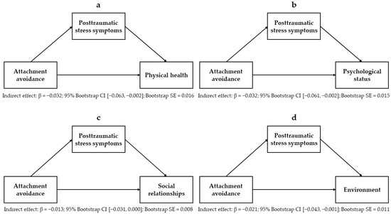 Mediating effects of posttraumatic stress symptoms on the relationships between attachment avoidance and the quality of physical health (a), psychological status (b), social relationships (c), and environment (d).