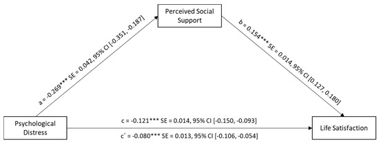 The simple mediation model (Model 4; [68]) used to analyze the effect of perceived social support on the relationship between psychological distress and life satisfaction (Figure 3) suggests that psychological distress is a significant negative predictor of perceived social support (β = −0.27, t [512] = −6.46, p < 0.001, 95% CI = [−0.35, −0.19]). Conversely, social support was a significant positive predictor of life satisfaction (β = 0.15, t [511] = 11.23, p < 0.001, 95% CI = [0.13, 0.18]). However, the direct effect of psychological distress on life satisfaction was also significant (β = −0.08, t [511] = −5.97, p < 0.001). This indicates a partial mediation, with psychological distress remaining a significant predictor of life satisfaction when controlling for social support as a mediator. The total effect (R2 = 0.12, F [1512] = 71.29, p < 0.001) identifies a significant model that explains slightly more than 12% of the variance in life satisfaction (β = −0.12, t [512] = −8.44, p < 0.001, 95% CI = [−0.150, −0.093]).