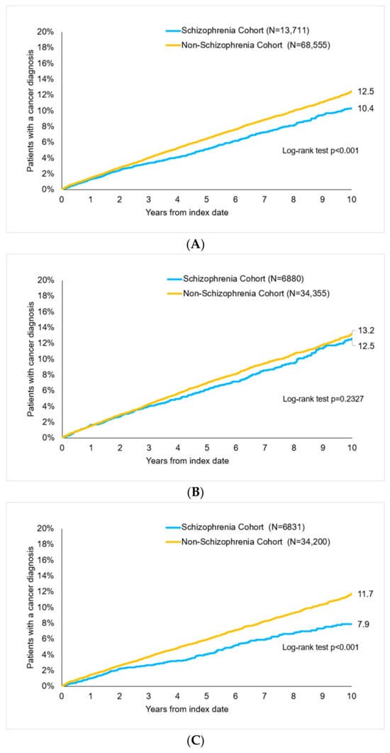 Cumulative incidence of cancer in patients with and without schizophrenia, log-rank test to analyze survival of schizophrenia cohort vs. non-schizophrenia cohort. (A) All patients. (B) Women. (C) Men.