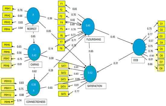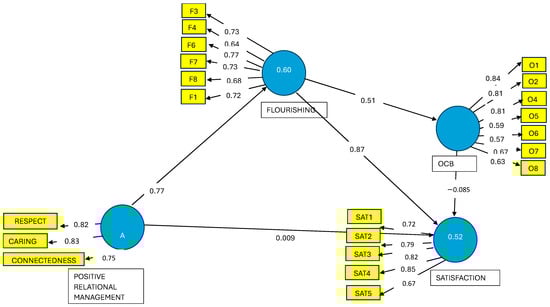 Stage 1 of the dissociated two-step approach []. Note: Execution of the PLS algorithm. We present the factor loadings or simple correlations between each indicator and its construct; standardized paths or β coefficients between constructs; coefficients of determination (R2) = value within constructs. OCB: organizational citizenship behaviors. PRM = positive relational management; O = organizational citizenship behavior; F = flourishing; SAT = satisfaction).