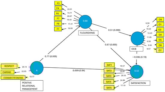The significance of the path coefficients was assessed using bootstrapping for consistent PLS (5000 subsamples). The association between flourishing and organizational citizenship behaviors was found to be significant (β = 0.50, p < 0.000), whereas the relationships between positive relational management and life satisfaction (β = 0.009, p = 0.93) and between organizational citizenship behaviors and life satisfaction (β = −0.08, p = 0.19) were not.