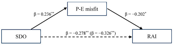 SDO was positively and significantly associated with perceived P-E misfit in the considered context (β = 0.236 and p < 0.001). In turn, the perceived P-E misfit was negatively and significantly associated with RAI (β = −0.202 and p = 0.002).
