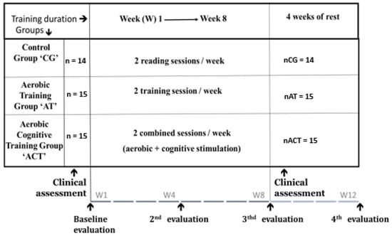 An 8-week randomized controlled trial of training interventions was carried out at the Laboratory of Exercise Physiology and Physiopathology (LR19ES09) in the Faculty of Medicine of Sousse, Tunisia. Cognitive assessments were conducted at baseline, midpoint, at the end of the training, and after a 1-month follow-up (4 weeks of detraining). The cognitive evaluation was randomized and counterbalanced for all adults with MCI. These evaluations were conducted under the supervision of a PhD student. For the cognitive assessments of elderly participants in this study, a comprehensive neuropsychological evaluation was administered by a qualified neuropsychologist. Neuropsychological assessments were administered to all participants at baseline and at the end of the training (see Figure 1).