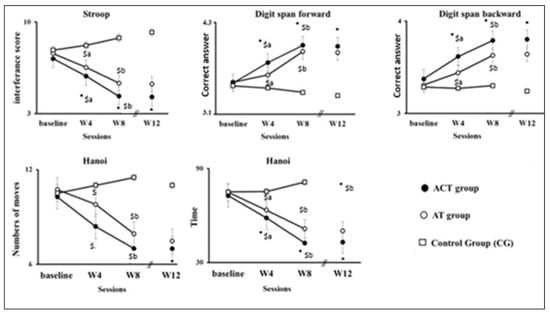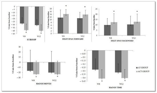 Figure 3 presents the percentage gain in cognitive performance registered at W8 and W12 compared with the baseline values. Overall, higher percentages of gain were recorded for ACT group compared with AT group in all tested tasks at both W8 and W12. These differences were statistically significant for the Stroop and Hanoi time tests (i.e., percent gains: ≈40% vs. ≈30% for ACT and AT, respectively) at both test sessions (all p < 0.05), as well as for the digit span forward at W12 (p = 0.04) and percent gains: ≈13% vs. ≈10% for ACT and AT, respectively).