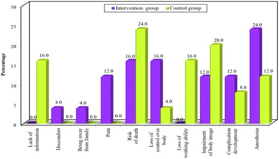 The participants in the intervention group reported that their sources of anxiety related to the following: fear of anaesthesia (24%), loss of control (16%), risk of death or complication development (16%), impairment of body image (12%), pain (12%), being away from family (4%), and discomfort (4%). The participants in the control group reported that their sources of anxiety were related to the risk of death (24%), impairment of body image (20%), loss of working ability (16%), lack of information (16%), anaesthesia (12%), complication development (8%), and loss of bodily control (4%). Figure 1 illustrates the sources of anxiety.
