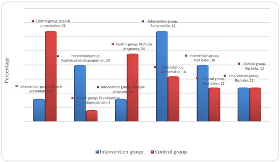 The main reasons for the participants in the intervention group undergoing CSs were abnormal lying (32%), followed by cephalopelvic disproportion (20%), postdates (20%), large babies (12%), multiple pregnancies (8%), and breech presentation (8%). The reasons for the participants in the control group undergoing CSs were breech presentation (24%), multiple pregnancies (32%), abnormal lie (16%), postdates (12%), large babies (12%), and cephalopelvic disproportion (4%). Figure 2 illustrates the medical reasons for CS.