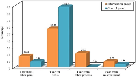 Figure 3 reveals that the main reason for most of the participants (88%) in the control group (88%) choosing elective CSs was fear for the foetus, whereas the rest of the participants reported fear of pain and fear of mistreatment (8% and 4%, respectively). More than half (56%) of the participants in the intervention group reported fear for the foetus, followed by fear of the labour process, fear of labour pain, and fear of mistreatment (20%, 16%, and 8%, respectively).