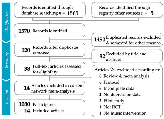 This NMA was guided by the PICO model (Population, Intervention, Comparison, Outcome), encompassing the following criteria: P—patients with depression in dementia; I—music therapy; C—any control group or alternative non-pharmacological intervention; O—standard measures of depression in dementia. Articles included in the analysis were required to meet the following criteria: (1) Randomized Controlled Trials (RCTs); (2) The intervention group received music therapy incorporating three elements of rhythm, melody, and harmony—while the control group received standard care, no treatment, or non-musical interventions; (3) The outcome assessments included measures of depression; and (4) Participants were diagnosed with dementia. Articles not meeting these criteria were excluded: (1) Publications such as review articles, medical protocols, conference papers, case reports, letters, editorials, pilot studies, and initial findings from ongoing research; (2) Studies where music therapy was combined with other therapies or used as a part of complementary or alternative treatments; (3) Control groups that included any accepted element of music; and (4) Studies lacking a primary outcome analysis. Finally, full texts of the eligible articles were used for the final network meta-analysis.