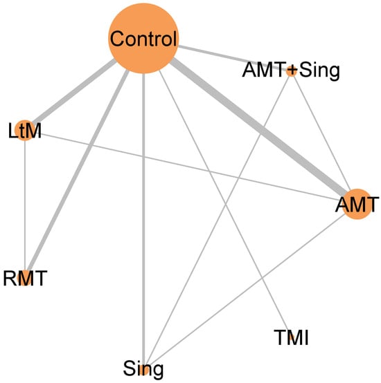 Network diagram illustrating the impact of various music interventions on improving post-activity depression in dementia. The size of each node and the thickness of each line indicate the quantity of trials incorporated in our study. Abbreviations: AMT: Active Music Therapy; RMT: Rhythmic Music Therapy; LtM: Listening to Music; TMI: Tailored Music Intervention.