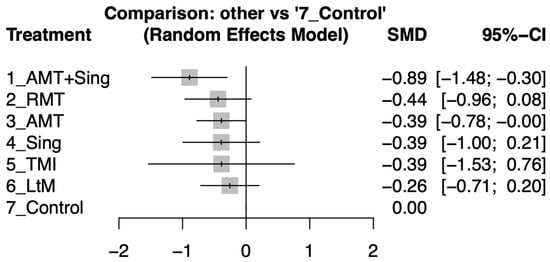 The network meta-analysis results indicated that AMT + Sing was the most effective treatment in improving depressive symptoms in elderly individuals with dementia, showing a significant effect size of −0.89 (95% CI: −1.48 to −0.30). RMT and AMT also showed improvements but were not as significant, with effect sizes of −0.44 (95% CI: −0.96 to 0.08) and −0.39 (95% CI: −0.78 to 0.00), respectively. Simple singing activities (Sing) and TMI each reported an effect size of −0.39 but with wide confidence intervals suggesting less certainty in the results. LtM showed the least impact with an effect size of −0.26 (95% CI: −0.71 to 0.20). The control group serves as the baseline for comparison, with other interventions measured against it (Figure 3). For an in-depth look at the pairwise comparisons between study arms, as detailed in individual studies (see Figure S2).