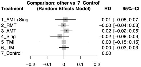 After the intervention period, there was no significant difference in dropout rates between the various music types and the control group, with all risk differences and their 95% confidence intervals overlapping with zero (see Figure 4). For a detailed analysis of the pairwise comparisons between study arms as reported in individual studies (refer to Figure S3).