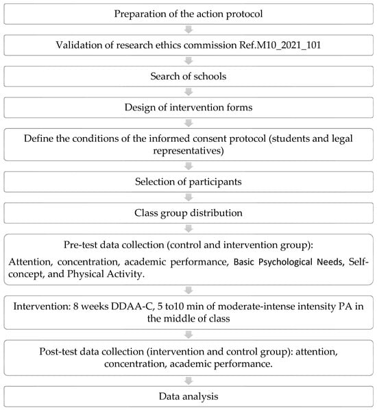 Data collection of attention, concentration, and academic performance variables was carried out in two phases for both the control and intervention groups (pre-test and post-test). The data collection of the variables Basic Psychological Needs (BNSG-S), Self-Concept AF5, and Global Physical Activity Questionnaire (GPACv2) in both the control and intervention groups was collected in the pre-test phase.