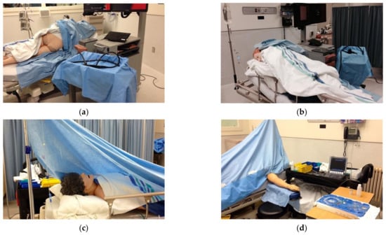 Examples of setups for full-scale, high-fidelity simulation of procedural sedation: colonoscopy (a,b) and brachial central venous line placement (c,d).