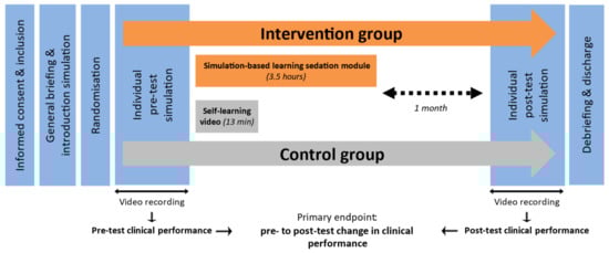 Simulation-based medical education involves placing students (or professionals) in artificial clinical situations engineered with varying degrees of realism and providing them with a concurrent or subsequent optimised debriefing [13]. This framework generates activating emotions in participants and fosters safe experiential learning [14]. Healthcare simulation enables reflective practice and metacognition. It is well suited to adult learners, who come in with prior knowledge, representations, and sometimes professional experience [15]. Simulation allows the adage “never the first time on the patient” to be respected and bridges specific gaps in traditional clinical training, such as trainees’ random—and often late—exposure to rare events. The pedagogical impact of simulation-based medical education has been evidenced for all Kirkpatrick levels [16], outperforming traditional clinical medical education [17]. Even if the simulation is time- and human-consuming, its cost efficiency has been repeatedly suggested [18,19]. Simulation seems especially relevant for learning about teamwork and crisis resource management [20]. Simulation, due to its potential efficacy in imparting both technical and non-technical skills, is a pivotal element of the anaesthesiology residency program at the University of Montréal. We hypothesized that simulation training could provide non-anaesthesiology residents with the knowledge and skills necessary to manage sedation and its complications. Following the development of an innovative simulation-based learning module, we conducted a randomized controlled trial to evaluate whether it resulted in improvements in the management of sedation-related complications.