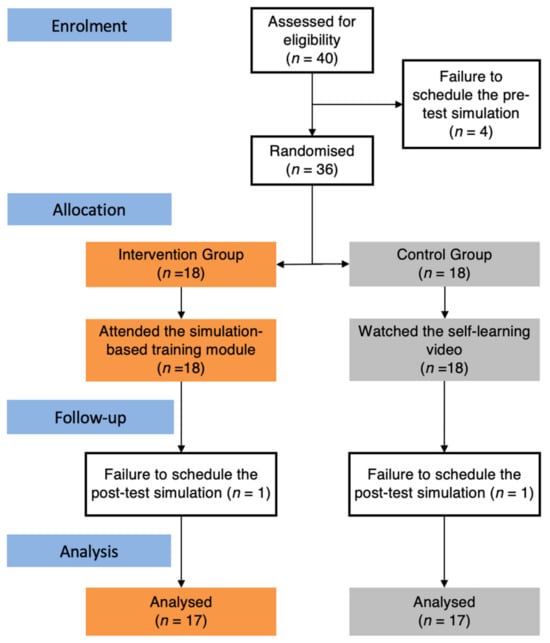 Figure 3 displays the study flowchart. Of the 40 initial volunteer residents, 36 were randomised and completed the pre-test simulation, and 34 (17 per group) completed the post-test simulation. These residents belonged to different programs (radiology, internal medicine, and family medicine) and varied in seniority (from postgraduate year 1 to 4), with a balanced distribution between the two allocation groups.