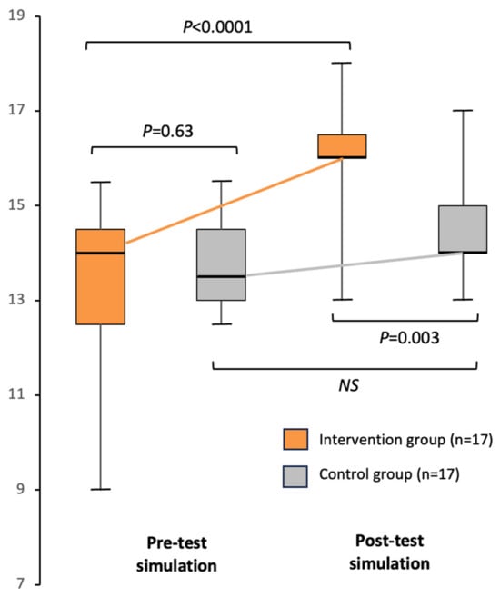 Figure 4 illustrates the raw clinical performance scores after averaging the two assessments for each performance. The baseline clinical performance (pre-test simulation) was similar between the intervention and control groups (p = 0.63). The improvement in clinical performance from pre-test to post-test was significantly greater in the intervention group compared to the control group (mean (SD) = +2.4 (1.6) points versus +0.8 (1.3) points, respectively; p = 0.002). Consequently, post-test clinical performance was significantly higher in the intervention group compared to the control group (16.0 [16.0–16.5] versus 14.0 [14.0–15.0] points, respectively; p = 0.003).