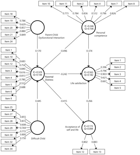 To evaluate the robustness of the factor loadings and the significance between the variables, the Bootstrapping procedure was used with 2000 subsamples [36,37], resulting in the structural model (Figure 2), which reports on the variables considered in this studio. The predictive relevance and standardized regression coefficient or life satisfaction path coefficient [(Q2 = 0.182); (R2 = 0.563)]; parental distress [(Q2 = 0.144); (R2 = 0.329)]; personal competence [(Q2 = 0.106); (R2 = 0.246)]; and acceptance of self and life [(Q2 = 0.094); (R2 = 0.172)], in the estimation of the measurement model, indicated a moderate fit of the model. In this sense, values of R2 above 0.67 indicate a substantial adjustment of the model, and above 0.33 a moderate adjustment.
