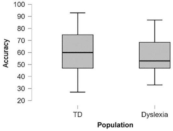 Accuracy (0–100) in the duration perception task for the typically developing (TD) vs. dyslexia group.