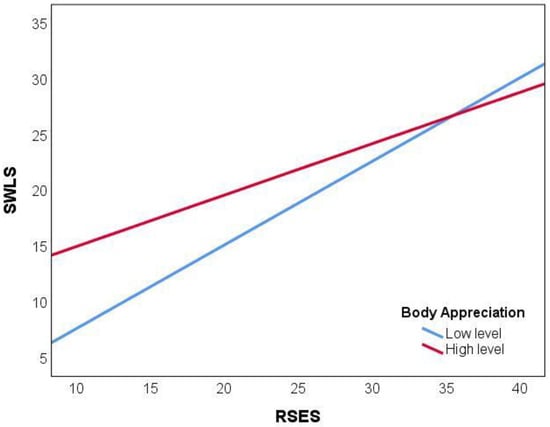 The moderating effect of body appreciation on the relationship between self-esteem (RSES) and life satisfaction (SWLS).