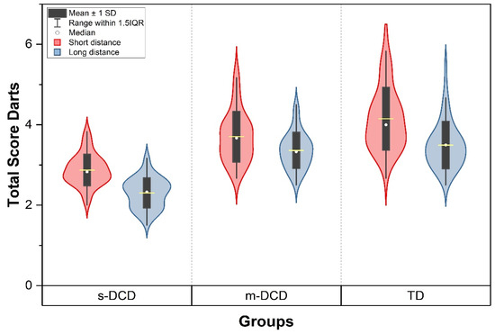 Post hoc analysis revealed that for the short-distance comparisons, dart score was significantly different between the TD- and m-DCD, TD and s-DCD, and m-DCD and s-DCD (all p ≤ 0.001). However, for long distance, the dart score was not different between the TD and m-DCD groups (p = 0.52) but only for the comparisons between TD and s-DCD (p < 0.001), and m-DCD and s-DCD (p < 0.001).