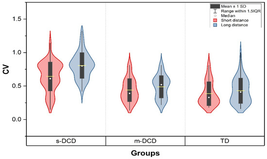 Coefficient of variation in the two conditions for the three groups. Performance is more variable in the long-distance task. Children with s-DCD are poorest in the task. CV in not different between TD and m-DCD groups. But differences in variability between TD and s-DCD, and m-DCD and s-DCD are significant (p < 0.001). s-DCD = severe DCD, m-DCD = moderate DCD, TD = typically developing, CV = coefficient of variation.