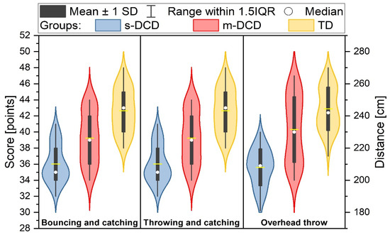 Aiming a ball at a target or other person so that it can be caught is a task that includes components that are common in many leisure and sports activities. Children with DCD are known to have poor aiming and throwing skills. The causes of the less coordinated movements in children with DCD are still unclear; only few studies have investigated ballistic movement precision to an external focus point [33,34,35], in which the central nervous system must predict the force and the final position of an object at which it must be released (predictive control). As hypothesized, compared to TD children, children with s-DCD were less accurate (as measured by the dart score) and had greater variability (as measured by the coefficient of variation) in performing a dart task. Children with m-DCD were only less accurate in the short-distance task. It was also confirmed that the task is harder if the children are standing further away from the target. Importantly, children with severe and more moderate coordination deficits differed in terms of the tested tasks, such as precision throwing (dart) or generating explosive power (overhead throw with a heavy sandbag). Not many studies looked at differences in performance between children with moderate and severe DCD. Given that the effect sizes of the differences between m-DCD and s-DCD indicate large differences (Cohen’s d are larger than 1) on all dart and ball skill items, this signifies that the cutoff values used for classifying DCD will impact the degree of task performance on other tasks.