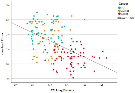 Scatterplot showing the association between the coefficient of variation of the dart score in the long-distance task and the distance thrown in the overhead throw of the sandbag (explosive power item of the PERF-FIT). Larger variability coincides with shorter distance of the throw, leading to negative correlations. TD = typically developing, m-DCD = moderate DCD, s-DCD = severe DCD. CV = coefficient of variation.