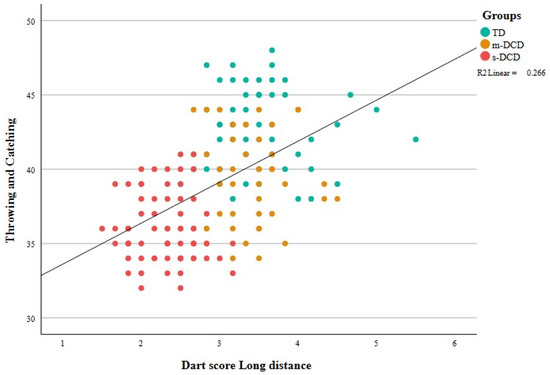 Scatterplot showing the association between the dart score in the long-distance task and the number of points in the throwing and catching task of the PERF-FIT. More precision of the dart throws coincides with more caught balls in the throwing and catching task, leading to positive correlations. TD = typically developing, m-DCD = moderate DCD, s-DCD = severe DCD.