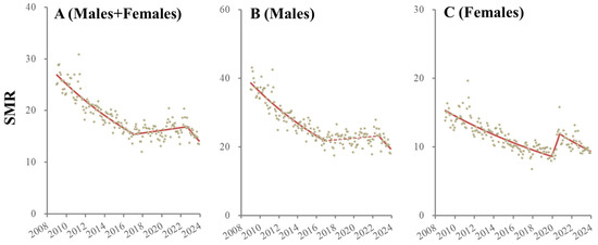 Temporal fluctuation of SMRs of males + females (A), males (B) and females (C) from January 2009 to December 2023 in Japan analyzed using joinpoint regression analysis. Ordinate and abscissa indicate the annualized monthly SMRs (per 100,000 population) and years, respectively. Grey circles indicate the observed monthly SMR values. Red lines indicate the results calculated by joinpoint regression analysis. Solid and dotted red lines indicate the significant and non-significant trends of SMRs, respectively.