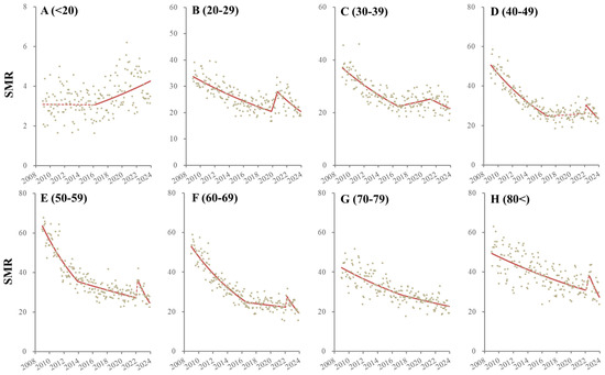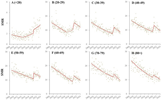 The male SMR for those aged <20 did not change until March 2016, but after April 2016, it consistently increased (Figure 2 and Table 2). The SMR for males aged 20–29 decreased from January 2009 to November 2019, but it significantly and sharply increased from December 2019 to September 2020 and significantly decreased from October 2020 to December 2023 (Figure 2 and Table 2). The SMR for males aged 30–39 decreased from January 2009 to October 2016 but reversed to significantly increase from November 2016 to April 2021 and then significantly decreased from May 2021 to December 2023 (Figure 2 and Table 2). The SMR for males aged 40–49 decreased from January 2009 to November 2016. It did not significantly change from December 2016 to December 2021 but non-significantly sharply increased (from January 2022 to March 2022) and significantly decreased from April 2022 to December 2023 (Figure 2 and Table 2). The SMR for males aged 50–59 consistently decreased from January 2009 to November 2013, but the decreasing trends attenuated from December 2013. Non-significant but sharply increasing trends from January 2022 to April 2022 were observed followed by a significant decrease from May 2022 to December 2023 (Figure 2 and Table 2). The SMR for males aged 60–69 also consistently decreased from January 2009 to January 2022, but the decreasing trends attenuated from October 2016. A non-significant but sharp increase from February 2022 to April 2022 was also observed, followed by a significantly decreasing trend from May 2022 to December 2023 (Figure 2 and Table 2). The SMR for males aged 70–79 consistently decreased during the observation period, but the decreasing trends attenuated from March 2017 (Figure 2 and Table 2). The SMR for males over 80 consistently decreased from January 2009 to January 2022. A non-significant but sharp increase from February 2022 to July 2022 was observed, followed by a significantly decreasing trend from August 2022 to December 2023 (Figure 2 and Table 2).