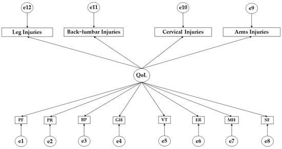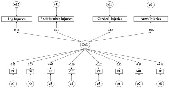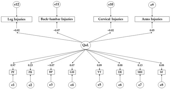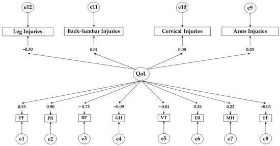 Table 5 and Figure 4 present the results obtained for participants with high adherence to the Mediterranean diet. A positive effect of the health-related quality of life on physical function (β = 0.969), physical role (β = 0.551), emotional role (β = 0.082), mental health (β = 0.128), vitality (β = 0.094), social functioning (β = 0.081), and general health (β = 0.071) is denoted. In contrast, a negative effect of the health-related quality of life (QoL) on bodily pain (β = −0.069) was observed. The effect of the health-related quality of life (QoL) on leg injuries (β = −0.016; p < 0.001), back–lumbar injuries (β = −0.066; p < 0.001), cervical injuries (β = −0.021; p < 0.001), and arm injuries (β = −0.047; p < 0.001) was also observed.