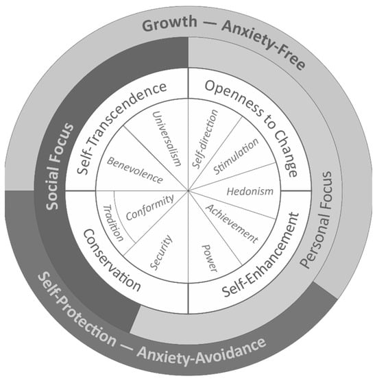 Schwartz’s theory of personal values [,] is a solid framework to understand values in sport and non-sport contexts [,,]. Personal values are defined as desirable goals, stable across situations and time, that serve as guides for the conscious organization of emotions, attitudes, and behaviors []. Ten value domains are included in Schwartz’s original theory, with a circular structure where values that are close in structure are values that are compatible with each other (e.g., achievement and power), while opposite values in structure are values that would conflict with each other (e.g., power and universalism). This structure is organized into four higher-order motivations that form two bipolar and opposite dimensions (see Figure 1). One dimension opposes values that emphasize independence of judgment and action and favor change (openness to change) with those that emphasize preservation of traditions and protection of stability (conservation). The second dimension involves self-enhancement versus self-transcendence, contrasting values that emphasize the pursuit of personal success and dominance over others with those values that emphasize acceptance of others as equals and concern for their well-being []. Further classification of values distinguishes them according to their focus; self-transcendence and conservation are values with a social focus, whilst self-enhancement and openness to change are values with an individual focus. Finally, this theory of personal values also distinguishes between those values that promote anxiety-free growth (i.e., conservation and self-enhancement) and those values that prioritize self-protection or anxiety avoidance (i.e., self-transcendence and openness to change, see Figure 1). Although the original theoretical model was later refined by subdividing the original ten values into 19 basic values, both theoretical frameworks (classic and refined) are considered valid in the prediction of positive and negative outcomes derived from these values []. This universal circular structure facilitates a methodical association between values and behaviors [].
