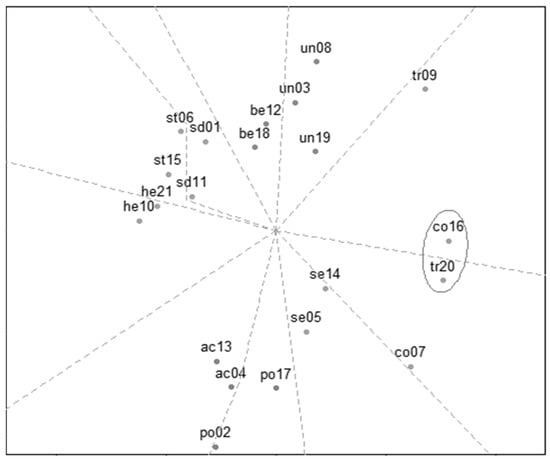 The spatial distribution of the solution found shows deviations from the theoretical circular motivational model originally proposed. Specifically, item 16 (conformity) and 20 (tradition) are inverted and placed equidistant from the center and not in the same sector as theorized. Furthermore, benevolence and universalism are also misplaced. The former is on the openness to change side and the latter on the conservation side. Despite this misplacing, the overall circular structure is replicated and the higher-order values have an accurate location in the MDS analysis.