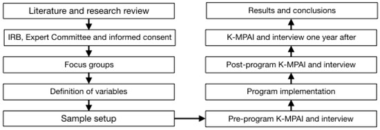 Once the content of the proposed design is validated, a pilot study is conducted to evaluate its effectiveness in reducing MPA. For this purpose, pre- and post-measurements of MPA are carried out using the K-MPAI test [55]. Additionally, post-treatment MPA measurement is complemented with a qualitative evaluation of the program through a participant satisfaction questionnaire designed ad hoc (mixed design). Subsequently, one year after completing the program, participants undergo a re-assessment of MPA to evaluate the stability of the results obtained.