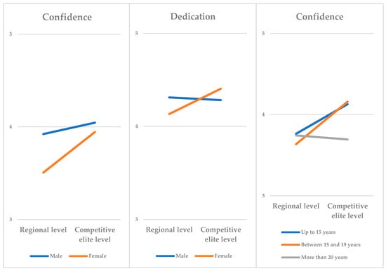 In terms of the interactions between factors, the study found that confidence and dedication varied in the interaction between gender and competitive levels (Figure 1). Males who participated as national athletes (competitive elite level) had the highest levels of confidence, while female athletes in lower competitive levels had the lowest levels. Therefore, the difference in confidence between genders was smaller (although still in favor of males) when the competitive level was high (p = 0.039). On the other hand, it was found that females in competitive elite level exhibited the highest levels of dedication, while female athletes in lower competitive levels had the lowest scores. In other words, dedication was greater among females at a higher competitive level (p = 0.027).
