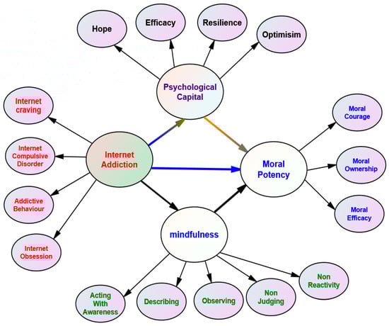 The multifaceted nature of IA has prompted investigations into various aspects, particularly adolescents’ moral potency. As moral potency helps students understand their behavior, their ability, and their courage to overcome challenges [12], it is important to nurture students to have good moral potency in life. In the current age, most students have behavioral problems of IA, which have several relationships with their mental health, moral potency, and other developmental aspects. However, studies focusing on the relationships of students’ behaviors (e.g., IA) and other important cognitive processes, such as MP, MI, and PsyCap, are scarce in the realm of educational research. Therefore, this study aims to investigate the relationships among students’ internet addiction (IA), moral potency (MP), mindfulness (MI), and PsyCap.