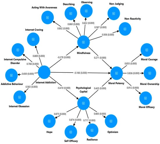 There has been relatively little research conducted on the connection between internet addiction (IA) and psychological capital (PsyCap) and moral potency (MP). Internet addiction refers to the excessive and compulsive use of the internet, leading to adverse effects on different aspects of an individual’s life, including their mental health and general well-being [1]. On the other hand, psychological capital pertains to a person’s positive psychological state characterized by hope, efficacy, resilience, and optimism [17]. While there is limited research specifically examining the relationship between IA and PsyCap, there is evidence to suggest that excessive internet use can have a negative impact on PsyCap [21]. Earlier studies have found a correlation between internet addiction (IA) and heightened indications of depression, anxiety, and diminished self-esteem, all of which can have a detrimental impact on psychological capital (PsyCap) [21]. Individuals affected by IA may exhibit lower levels of resilience, optimism, hope, and self-efficacy. However, additional research is required to establish a direct and definitive relationship between these variables. Furthermore, IA negatively predicts MP. The literature states that MP is essential for ethical behavior and can influence various aspects of an individual’s life, including their relationships, decision making, and overall well-being [29,30]. Individuals with higher MP may be less prone to excessive internet use due to their strong sense of values and self-regulation [21]. However, problematic internet use can potentially impact moral decision making and behavior [31]. In addition, excessive internet use can lead to a decrease in face-to-face social interactions and a blurring of online and offline identities [32]. This may result in reduced opportunities for individuals to practice and develop moral values and ethical behavior.