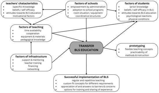 Figure 1 describes the interactions between individual factors of teachers, factors of teaching and schools, factors of infrastructure (i.e., transfer support) and factors of students for the implementation process of BLS education in secondary schools.