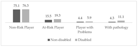 Finally, the authors of [27] compared the risk of gambling addiction between players with disabilities and non-players and found that a higher percentage of teenagers who were probable pathological gamblers reported having a learning disability (22.3% vs. 9.4%) or cognitive problems (42.5% vs. 13.6%). These authors suggested that these findings were justified by the different risk perceptions of gambling, as well as by a series of factors, such as stress, social isolation, a lack of alternative activities and barriers to accessing support services.