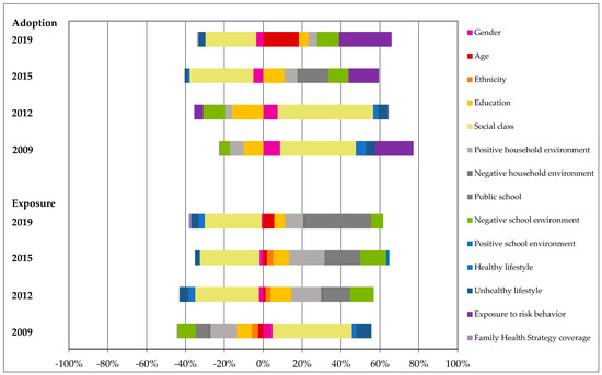 Figure 1 presents the proportional contribution of the main groups of determinants of socioeconomic inequalities to the concentration indexes. The positive concentration indexes, representing a higher incidence of multiple health risk behaviors among wealthier individuals, present a distribution of determinants skewed to the positive effects (right side of the graph) for the exposure to and adoption of risk behaviors in 2009, changing to negative concentration indexes for the exposure to multiple risk behaviors in 2012, and for the adoption of multiple risk behaviors in 2015.
