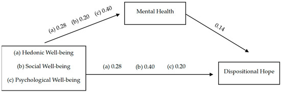 We conducted a mediation analysis to examine whether mental health mediates the relationship between well-being and dispositional hope (hypothesis 4). The indirect effects for hedonic well-being (β = 0.05; 95% CI [0.008, 0.092]), psychological well-being (β = 0.04; 95% CI [0.007, 0.079]), and social well-being (β = 0.03; 95% CI [0.006, 0.052]) were all significant, indicating a mediating effect.
