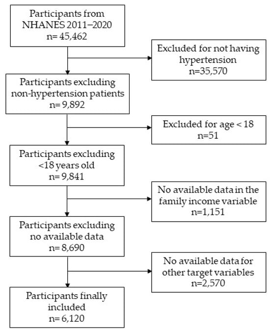 The NHANES 2011–2020 has a total of 45,462 participants (22,472 males and 22,990 females). To make up the sample for the present study, 35,570 participants were excluded because they did not have hypertension; 51 participants were excluded because they were younger than 18 years; and 1151 participants were excluded because they did not have data available on the grouping variable of “family income under the poverty threshold”. In addition, all those participants who did not have valid data on the following target variables were excluded: physical inactivity (536 participants were excluded); negative perception of their own health (9 participants excluded); unhealthy diet (3 participants excluded); 4/5 alcohol drinks a day (1898 participants excluded); congestive heart failure (55 participants excluded); coronary heart disease (32 participants excluded); angina pectoris (19 participants excluded); heart attack (8 participants excluded); and stroke (10 participants excluded) (Figure 1).