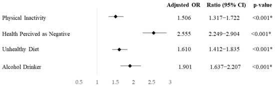 In Figure 2, it can be seen that participants with a family income considered as being under the poverty threshold were found to have an increased odds ratio of perceiving their health as negative (OR= 2.555; CI95% = 2.249–2.904; p < 0.001). Additionally, these participants were shown to have greater odds of being physically inactive (OR: 1.506; CI95%: 1.317–1.722; p < 0.001), having a non-healthy diet (OR: 1.610; CI95%: 1.412–1.835; p < 0.001), and being a drinker or former drinker (OR: 1.901; CI95%: 1.637–2.207; p < 0.001).